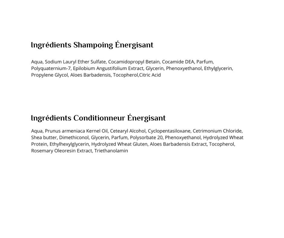 Le conditionneur énergisant est composé d'huile de noyau d'abricot, de beurre de karité, de vitamine E et d'huile essentielle de romarin protège et nourrit la fibre capillaire.